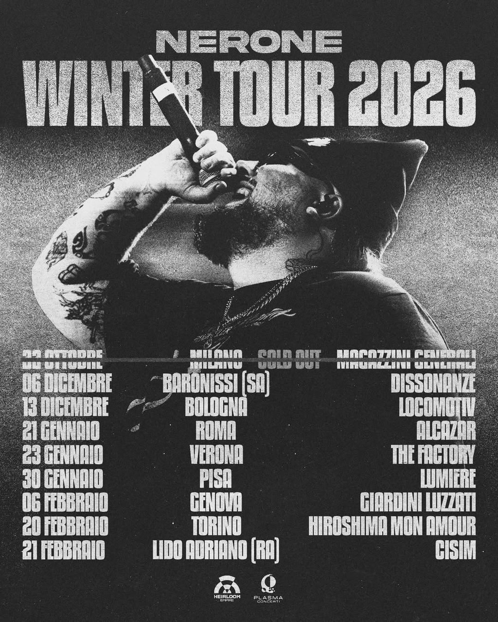 Le date del Winter Tour saranno comunicate e aggiornate sui canali ufficiali di Plasma Concerti e di Nerone, con tutte le informazioni su biglietti, città e venue coinvolte.