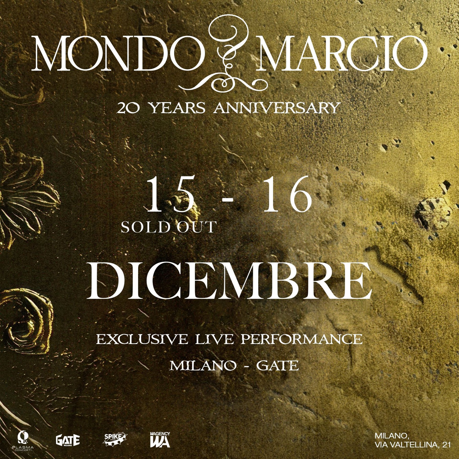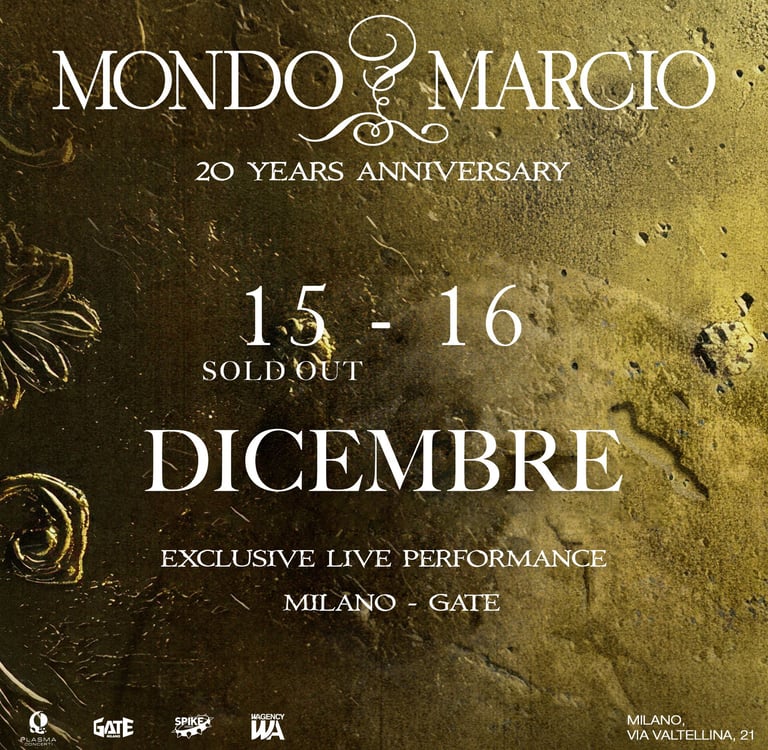 Dopo l'annuncio del live di Mondo Marcio al Gate di Milano i biglietti sono andati sold out in pochi giorni, annunciata una seconda data il 16 Dicembre 2024.